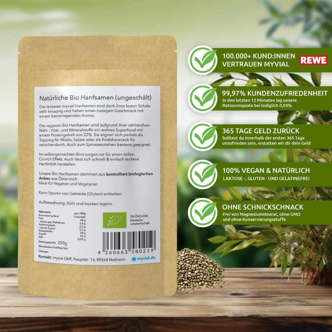 Die kleinen Hanfnüsse sind mittlerweile aus der deutschen Küche nicht mehr wegzudenken. Sie eignen sich perfekt als Topping für Müslis, Süßspeisen, Salate oder als Knabbersnack für zwischendurch. Selbst im Brot sorgen sie für einen tollen Crunch-Effekt. Auch zum Sprossenziehen sehr geeignet. Mit Hanfsamen lässt sich auch schnell und einfach eine leckere Hanfmilch herstellen. In Hanfsamen sind keine Gluten oder Laktose enthalten. Auch sind keine Allergene bekannt.Product may differ from illustration
