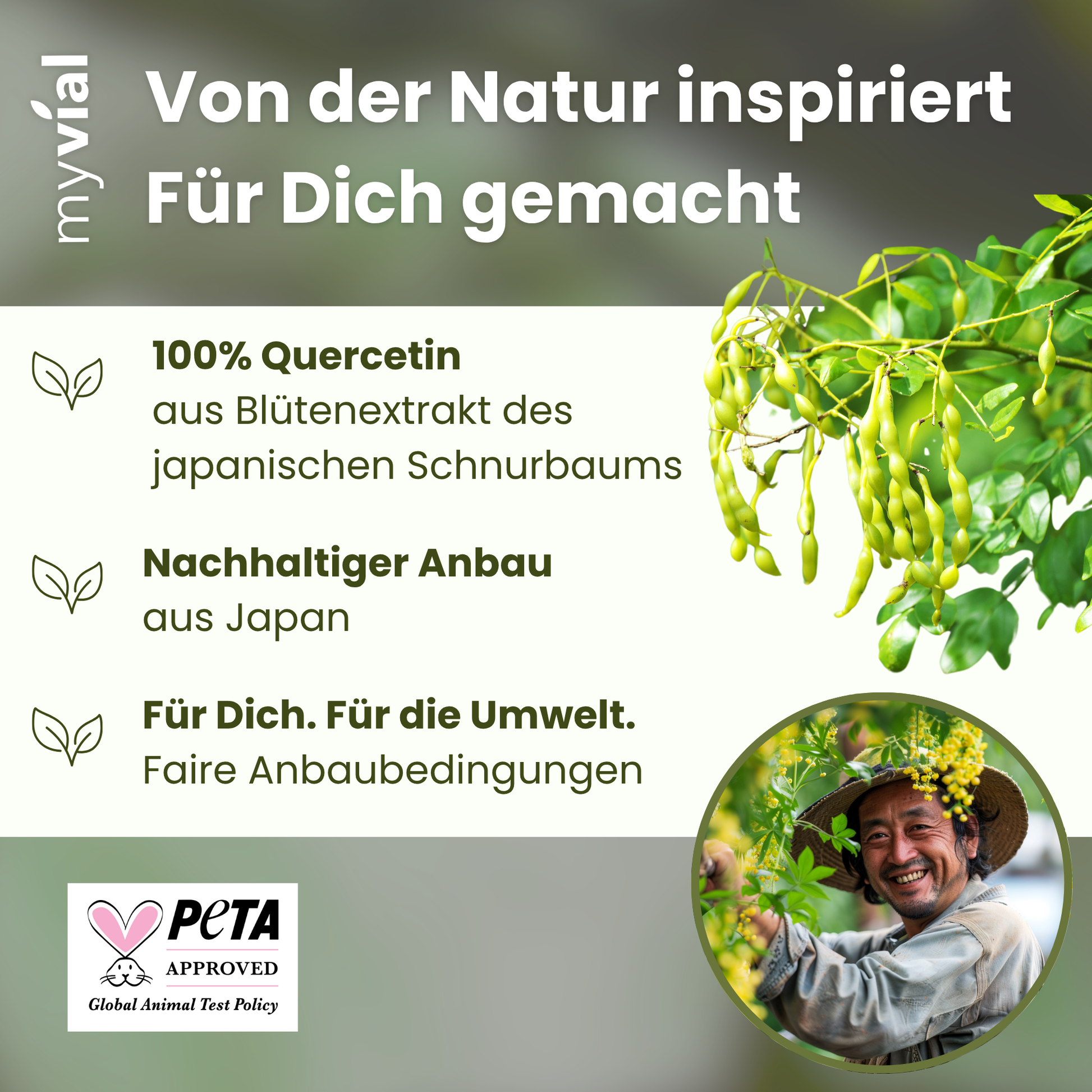 Unsere Kapseln enthalten reines Quercetin aus sorgfältig ausgewähltem japanischen Schnurbaum-Extrakt.